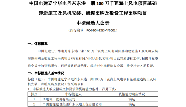 海洋能源網(wǎng)獲悉,近日,中國電建陽光采購網(wǎng)發(fā)布了《中國電建遼寧華電丹東東港一期100萬千瓦海上風(fēng)電項目基礎(chǔ)建造施工及風(fēng)機(jī)安裝、海纜采購及敷設(shè)工程采購項目中標(biāo)候選人公示》。公告顯示,華電科工股份有限公司為第一中標(biāo)候選人,中國能源建設(shè)集團(tuán)廣東火電工程有限公司為第二中標(biāo)候選人。