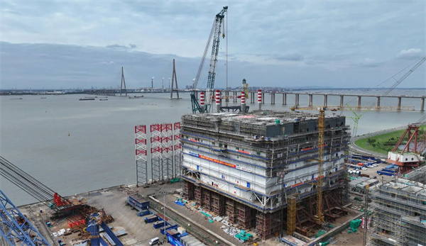 三峽陽(yáng)江青洲海上換流站為當(dāng)前國(guó)內(nèi)單體容量最大的海上換流站,其外形尺寸約82.5米×85.5米×44米,上部組塊鋼結(jié)構(gòu)重約1.7萬噸,含設(shè)備總重約2.8萬噸。在建設(shè)模式上,項(xiàng)目創(chuàng)新采用“陸上總裝、整體運(yùn)輸、浮托安裝”方案,大幅提升施工效率與工程質(zhì)量,為同類項(xiàng)目提供了可借鑒的“振華方案”。