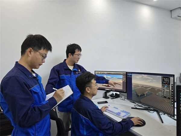 項目施工期間,項目團隊大力培育新質(zhì)生產(chǎn)力,深度運用BIM技術(shù),通過建立光伏場電子沙盤,動態(tài)模擬生產(chǎn)總體部署,實現(xiàn)項目建設(shè)全周期管控。平臺拼裝、沉樁、平臺安裝等關(guān)鍵工序的施工方案可視化交底,確保了12個關(guān)鍵節(jié)點精準把控,創(chuàng)造單日完成9個平臺安裝的記錄,工效提升20%。