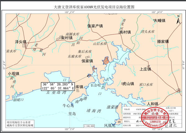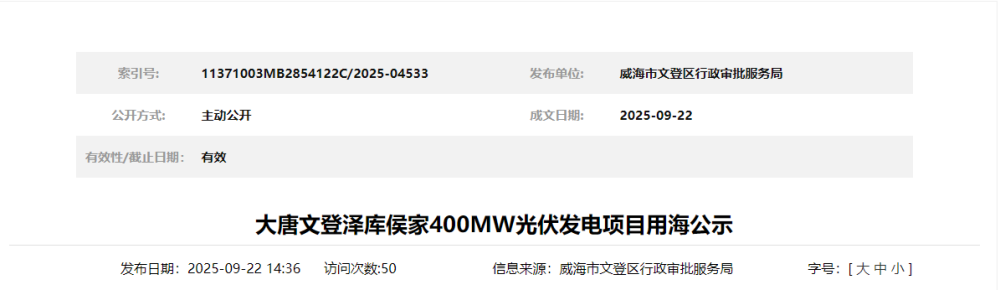 9月22日,山東威海文登區(qū)行政審批服務(wù)局再次發(fā)布大唐文登澤庫(kù)侯家400MW光伏發(fā)電項(xiàng)目用海公示。