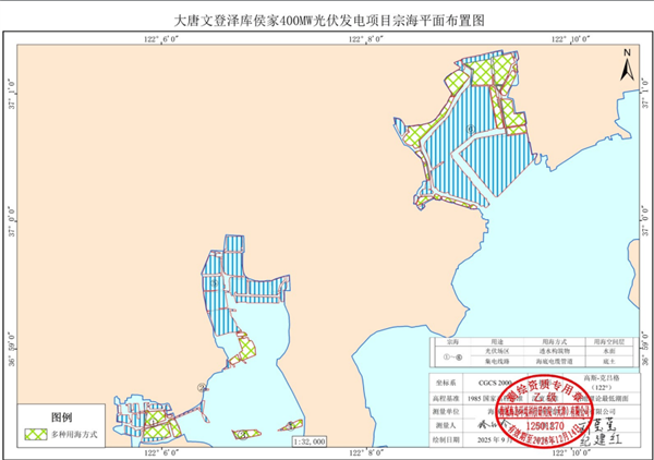 與8月公示情況相比,此次公示的用海面積從383.3566公頃調(diào)整至350.0566公頃。根據(jù)公示,大唐(威海)綠色能源發(fā)展有限公司擬在文登區(qū)澤庫(kù)鎮(zhèn)花島村東側(cè)和侯家鎮(zhèn)潘家村東側(cè)海域,投資建設(shè)400MW光伏發(fā)電項(xiàng)目,用海年限26年,屬電力工業(yè)用海類(lèi)型 。