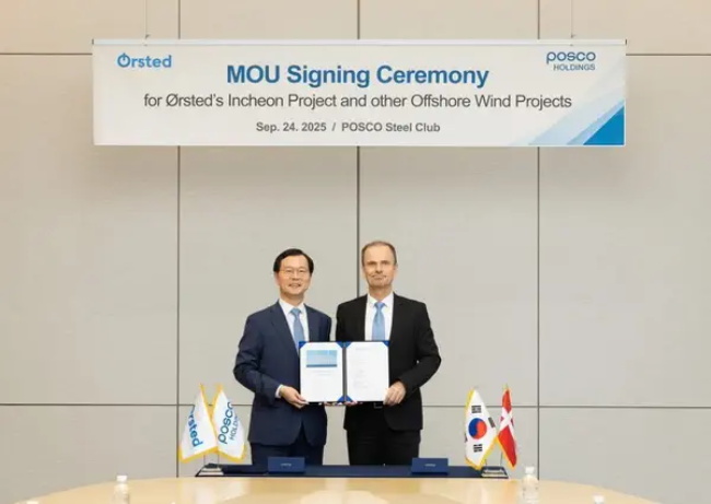 海洋能源網獲悉,韓國鋼鐵制造商POSCO集團于2025年9月24日與丹麥Ørsted公司簽署了一份諒解備忘錄,以共同開發(fā)韓國最大的海上風電項目——1.4吉瓦仁川海上風電場。