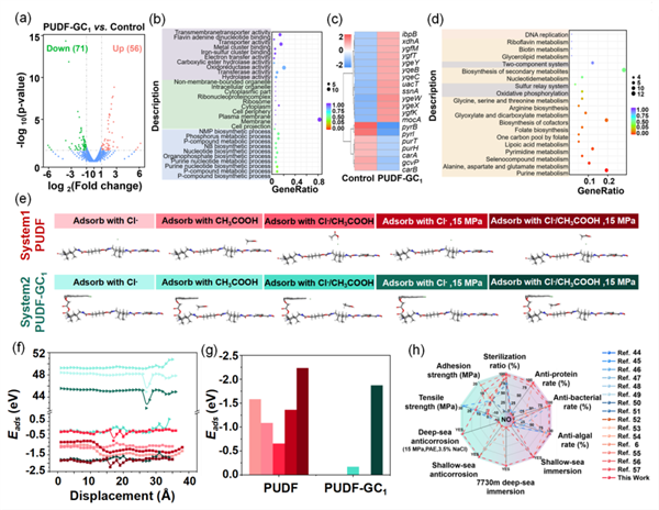 實(shí)驗(yàn)結(jié)果表明,該涂層在東海(2m)淺海與菲律賓海域(7730m)深海掛板2個(gè)月可以有效抑制淺海大型污損生物及深海微生物等污損生物的附著,展現(xiàn)出優(yōu)異且穩(wěn)定的全海深防污效果。同時(shí),涂層樣品長(zhǎng)期浸泡在15 MPa高壓+高鹽+高濃度細(xì)菌的模擬耦合腐蝕環(huán)境中,展現(xiàn)出了優(yōu)異的防腐性能。進(jìn)一步轉(zhuǎn)錄組學(xué)測(cè)試揭示了涂層通過(guò)干擾細(xì)菌嘌呤代謝途徑并抑制核苷酸合成的本征抗菌防污機(jī)制;第一性原理計(jì)算揭示了GO-COOH通過(guò)提高界面能壘,阻礙腐蝕離子和微生物代謝產(chǎn)物的滲透,實(shí)現(xiàn)低吸附/高屏蔽的協(xié)同防腐。