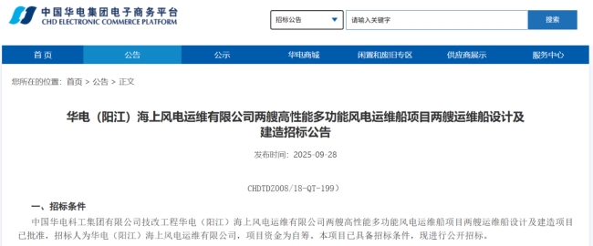 海洋能源網(wǎng)獲悉,9月28日,中國華電集團電子商務平臺發(fā)布了《華電(陽江)海上風電運維有限公司兩艘高性能多功能風電運維船項目兩艘運維船設計及建造招標公告》。