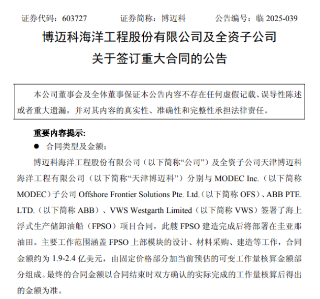 海洋能源網(wǎng)獲悉,博邁科于10月9日發(fā)布公告,公司及其全資子公司天津博邁科海洋工程有限公司(以下簡稱“天津博邁科”)近期分別與MODEC Inc.(以下簡稱“MODEC”)的子公司Offshore Frontier Solutions Pte. Ltd.、ABB PTE. LTD.、VWS Westgarth Limited簽署了海上浮式生產(chǎn)儲卸油船(FPSO)項目合同。該FPSO建造完成后將部署在圭亞那油田,為當?shù)赜蜌忾_發(fā)提供關(guān)鍵支持。