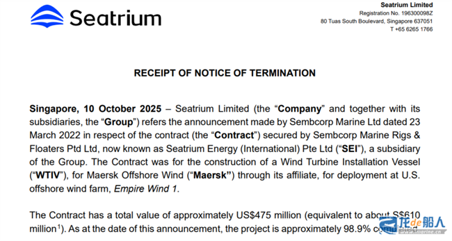 10 月 10 日,新加坡海工船企海庭(Seatrium)發(fā)布公告稱,該公司于 2025 年 10 月 9 日收到訂單終止通知,涉及前勝科海事時期旗下附屬公司勝科海事鉆井平臺與浮式裝置(Sembcorp Marine Rigs & Floaters)與馬士基海上風(fēng)電(Maersk Offshore Wind)簽訂的 1 艘風(fēng)電安裝船建造合同。