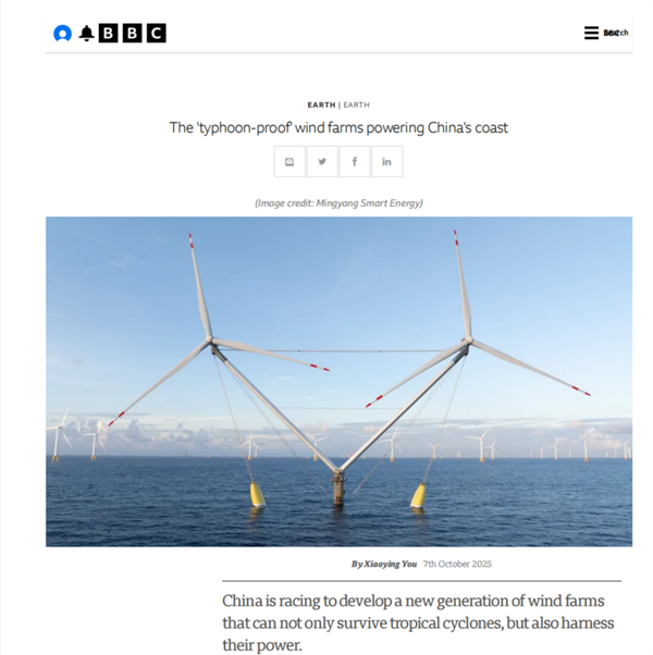 報(bào)道指出,每年5月至11月,源自西北太平洋的臺(tái)風(fēng)肆虐東亞和東南亞國(guó)家。中國(guó)主要企業(yè)通過綜合策略提升了風(fēng)機(jī)的抗災(zāi)能力,包括開發(fā)先進(jìn)材料、增強(qiáng)氣象預(yù)報(bào)能力以及升級(jí)風(fēng)機(jī)控制系統(tǒng)。加州非營(yíng)利組織全球能源監(jiān)測(cè)機(jī)構(gòu)(GEM)可再生能源研究員韓玉佳舉例說明,明陽(yáng)智能生產(chǎn)的“明陽(yáng)天成號(hào)”便是典范。