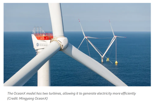 該浮式平臺(tái)不僅支撐一臺(tái),而是兩臺(tái)風(fēng)機(jī)。明陽(yáng)智能表示,這種獨(dú)特設(shè)計(jì)的核心在于提升平臺(tái)發(fā)電量。相比單臺(tái)風(fēng)機(jī)葉片掃過的面積,“明陽(yáng)天成號(hào)”雙風(fēng)機(jī)組合可覆蓋更大區(qū)域,發(fā)電量提升4.29%。該公司解釋稱,這是因?yàn)閮膳_(tái)風(fēng)機(jī)葉片并排反向旋轉(zhuǎn),從而使兩者之間的風(fēng)速加快,將空氣動(dòng)能轉(zhuǎn)化為電能的效率更高。